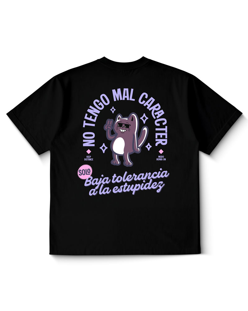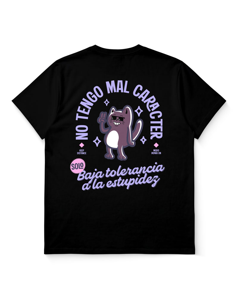 Polera con la frase “No tengo mal carácter, solo baja tolerancia a la estupidez”. Un diseño con humor ácido y personalidad fuerte, estampado de alta calidad para destacar.