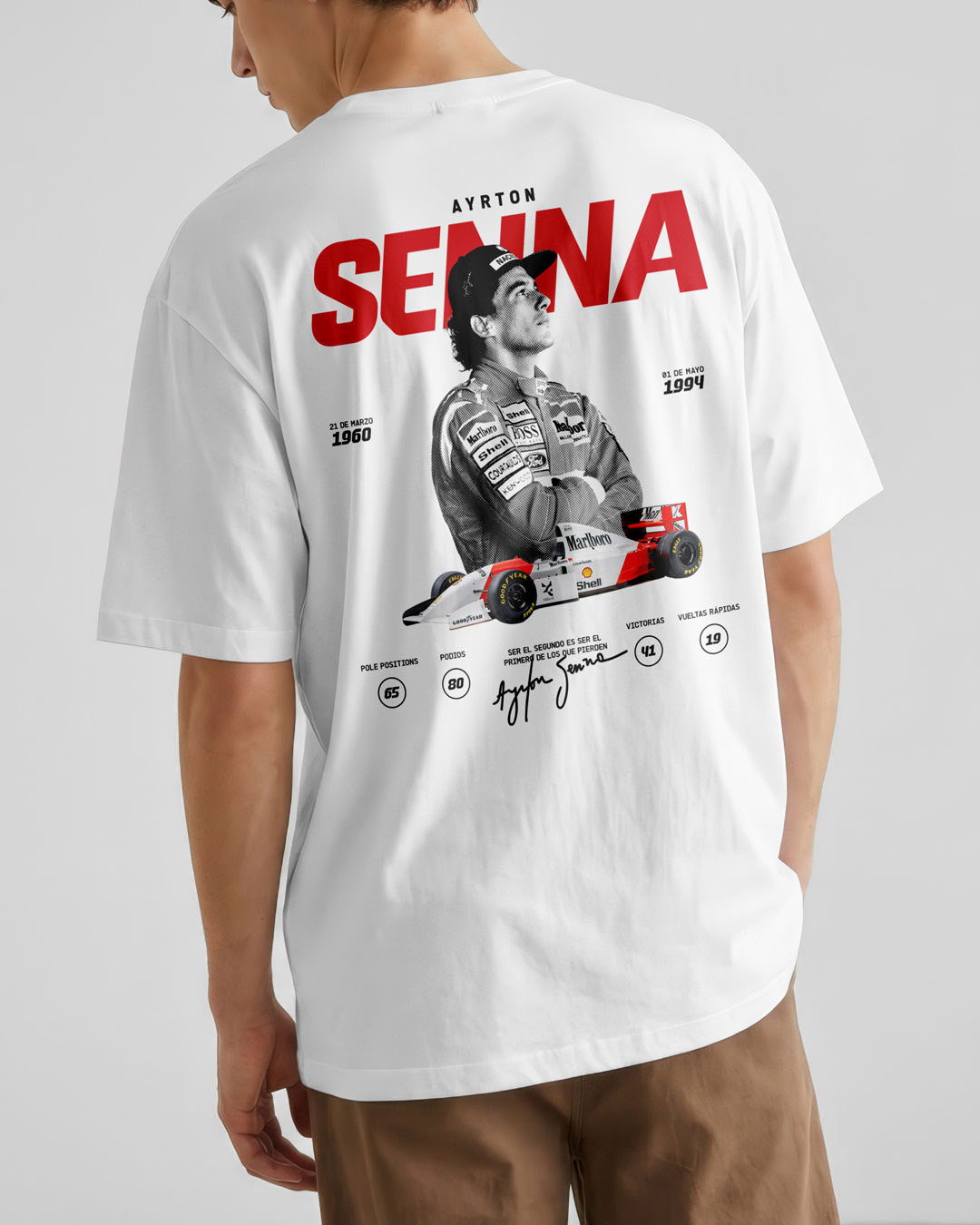 La esencia de una leyenda en la pista. Nuestra polera de Ayrton Senna celebra el legado del piloto más icónico de la Fórmula 1. Elige tu estilo ideal: la suavidad clásica de nuestro Algodón Combed o el estilo urbano de nuestra versión Oversize, diseñada para quienes buscan un calce ancho, cómodo y con una caída superior.