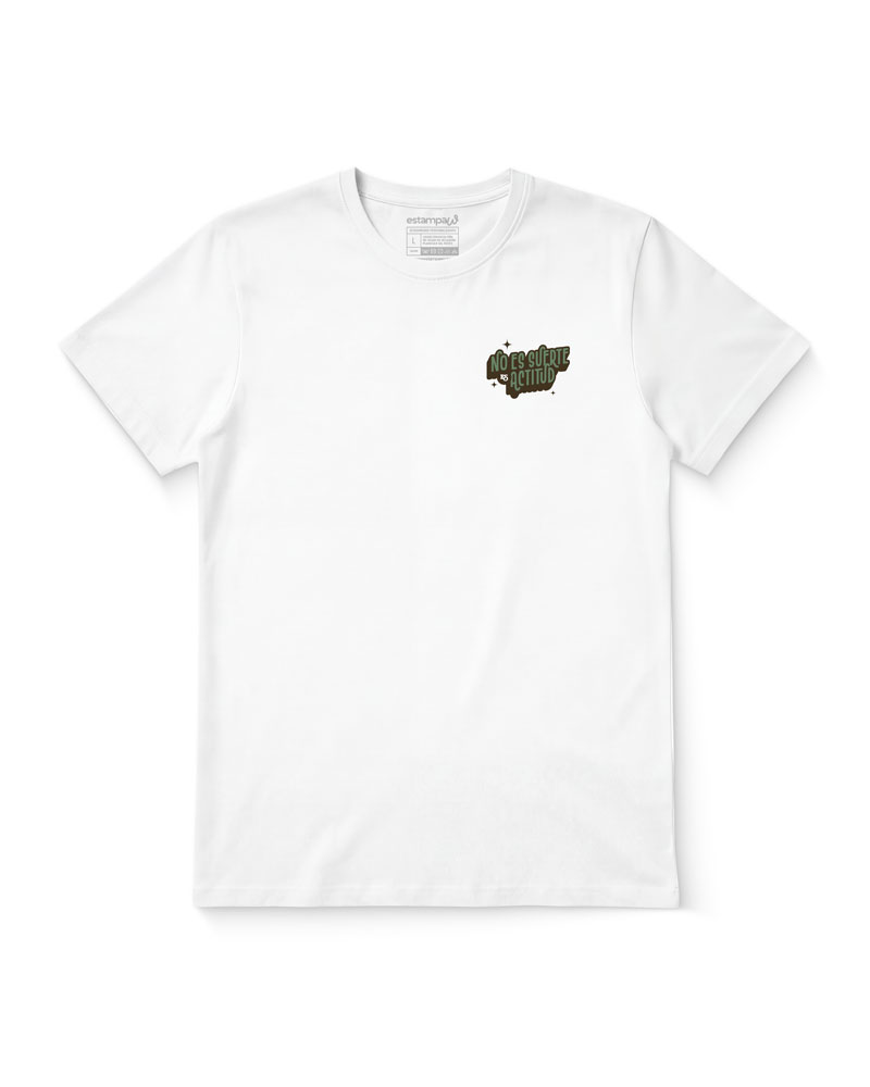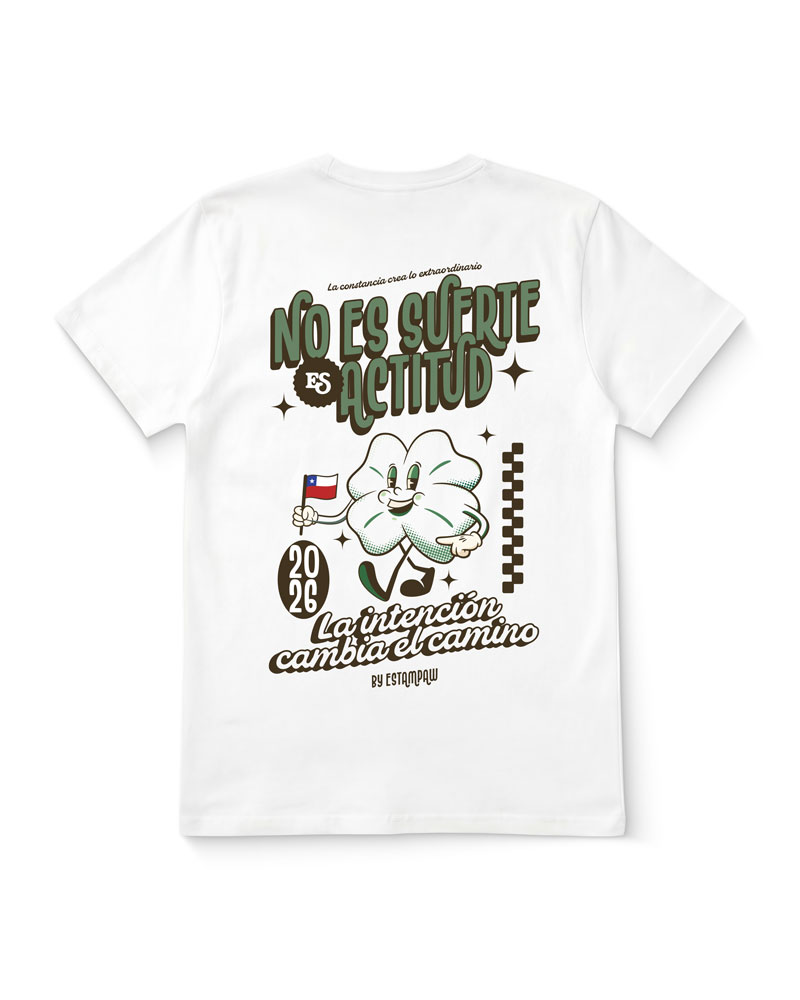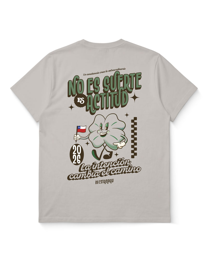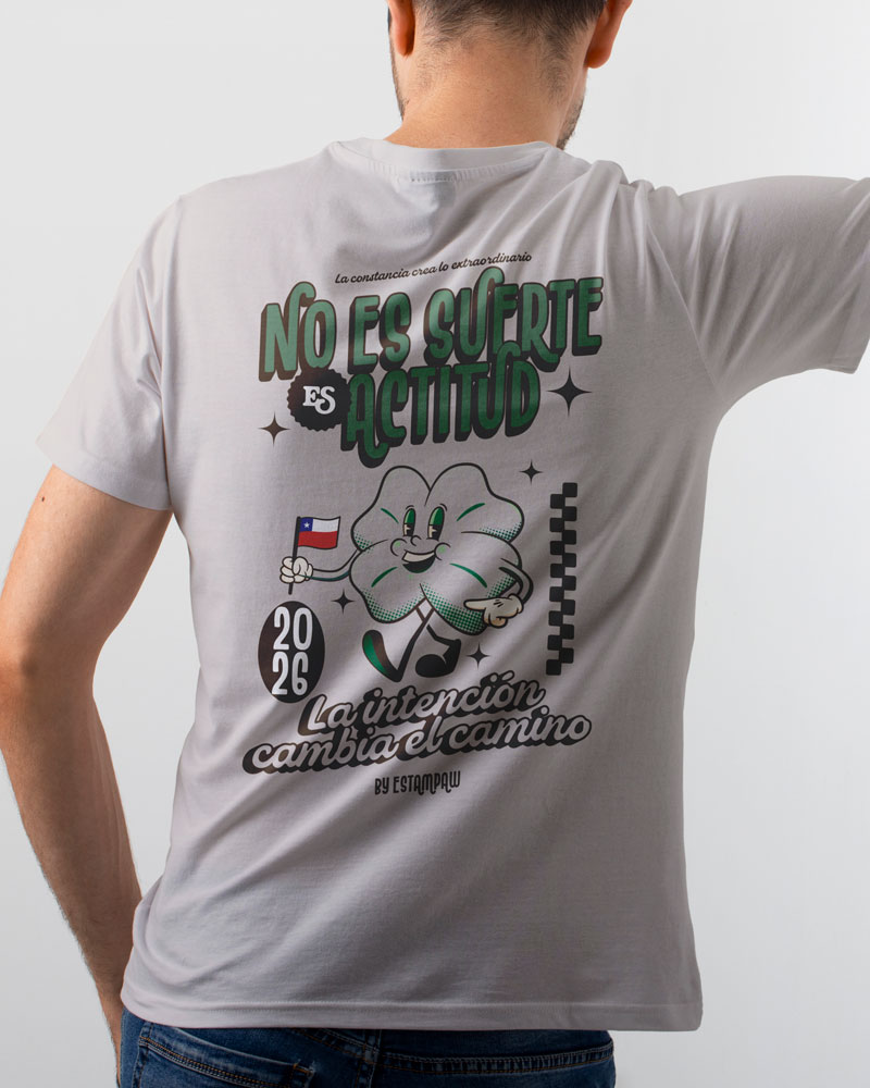 Polera con la frase “No es suerte, es actitud”. Un diseño motivacional que transmite confianza y determinación, con estampado de alta calidad y estilo moderno.
