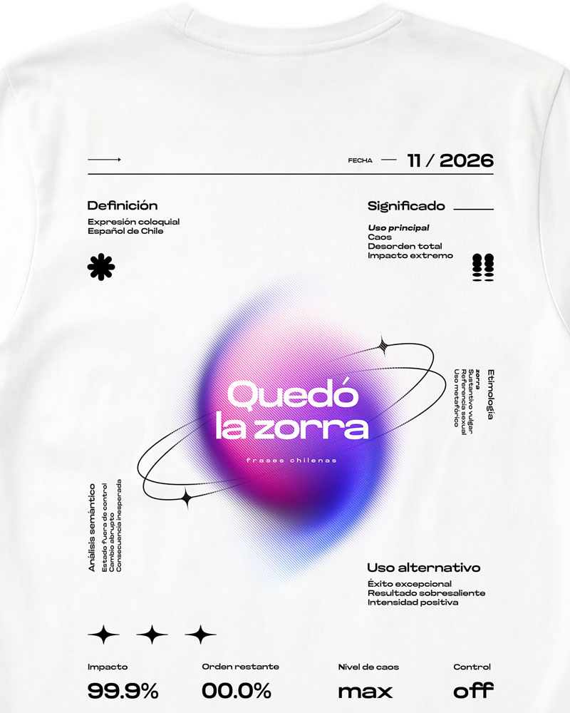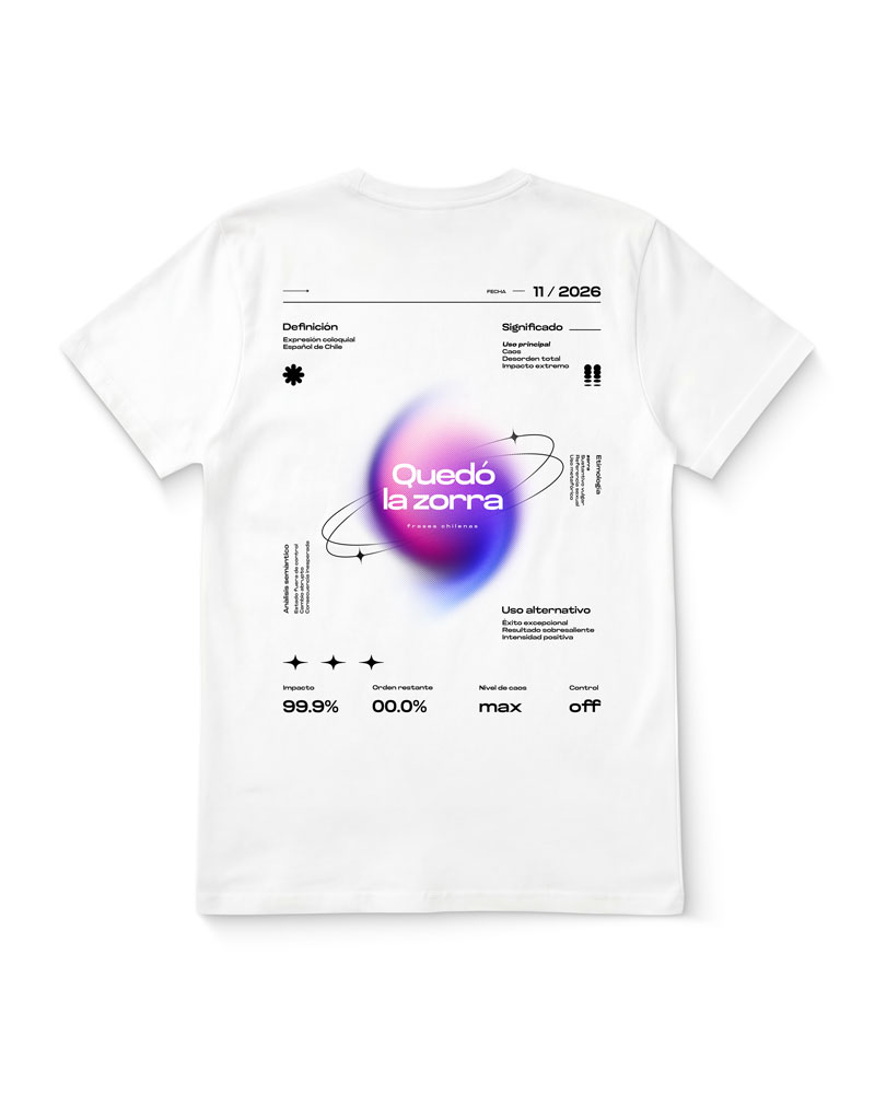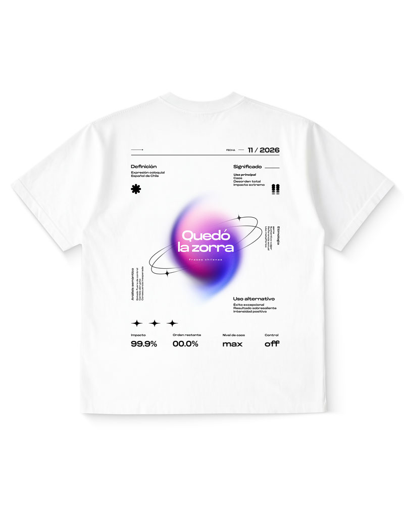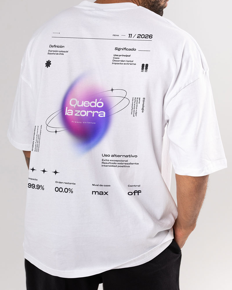 ¡Para que quede la zorra donde vayas! Nuestra polera celebra el modismo chileno definitivo, ya sea por el caos o por lo increíble. Fabricada en Algodón Combed o Blend 70/30 Oversize, ofrece comodidad premium y un estampado DTF que resiste todo.
